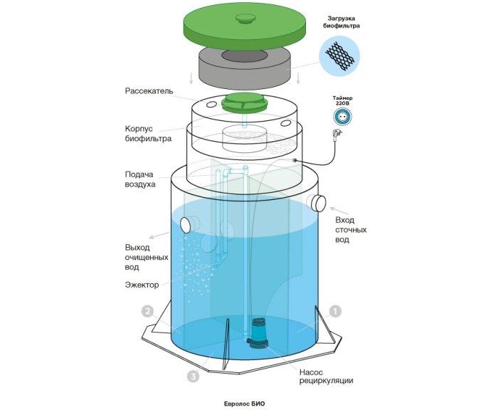 Локальное очистное сооружение (ЛОС) Евролос Био обеспечивает как грубую механическую, так и биологическую очистку канализационных сточных вод. Септик состоит из трех камер, эжекторной аэрации и биофильтра, расположенного в корзине биореактора — стоки циркулируют по этим камерам, неоднократно проходя через биофильтр. За одни сутки насчитывается 24 повторения цикла, в результате которых достигается очень высокая степень очистки воды, имеются сертификаты установленного образца. Дальнейший сброс очищенной воды в дренажный колодец или в грунт не требует дополнительной доочистки стоков. На выходе можно установить модуль обеззараживания стоков ультрафиолетом Евролос ЮВЛ.